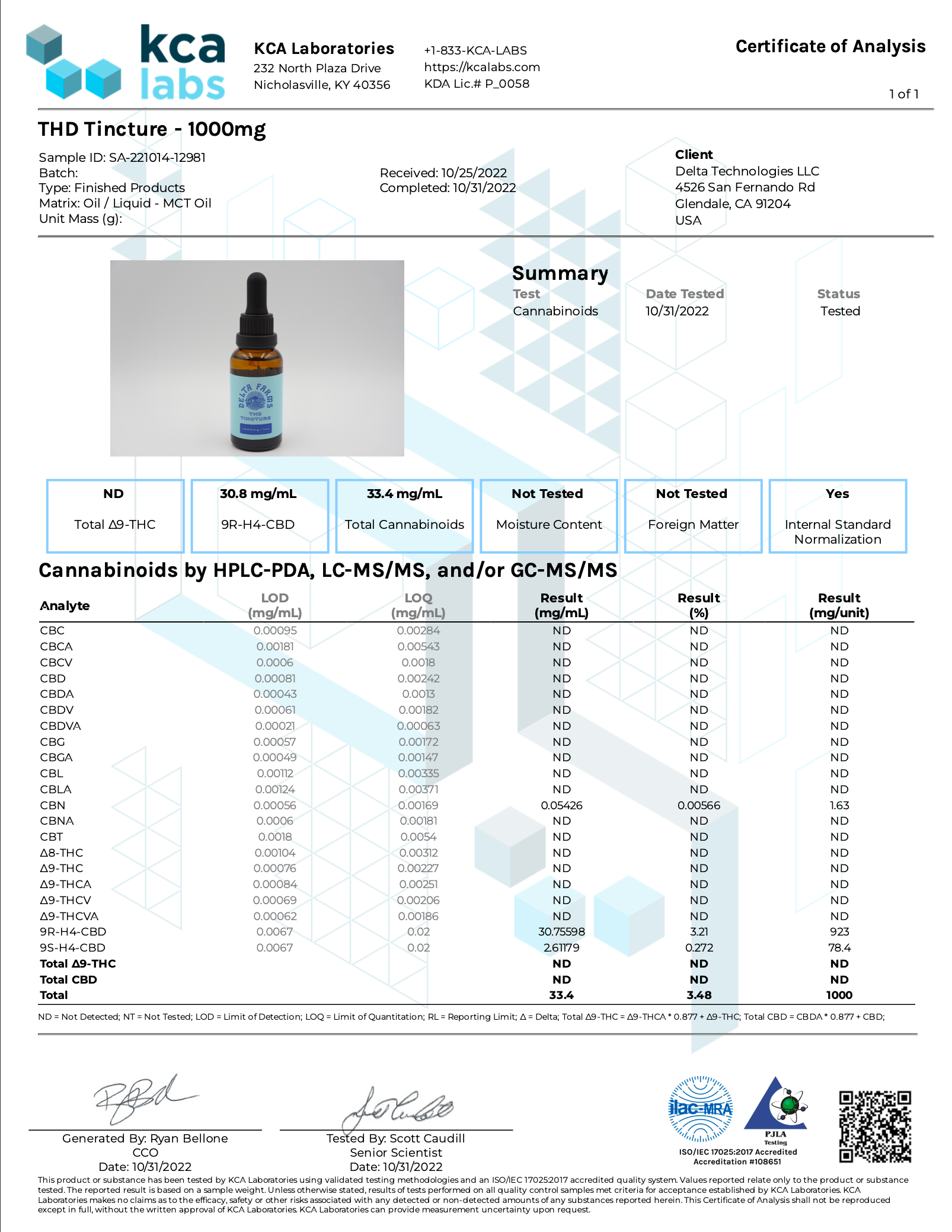 Our THD tinctures are tested in-house, and at KCA Labs. Click here for lab testing results.